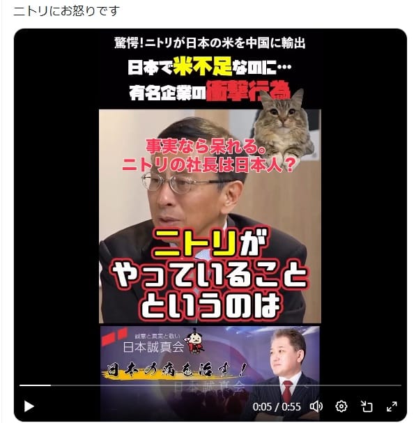 元の動画は、政治団体「日本誠真会」党首・吉野敏明氏の公式YouTubeチャンネルが2月に公開したYouTubeだ。今回、拡散した動画は、この一部を切り出して編集し、「事実なら呆れる。ニトリの社長は日本人?」というテロップと、猫の画像を加えている。(驚愕!ニトリが日本の米を中国に輸出【再投稿】 #食料安全保障 #米輸出 #ニトリ #北海道農業 #食糧危機”)。