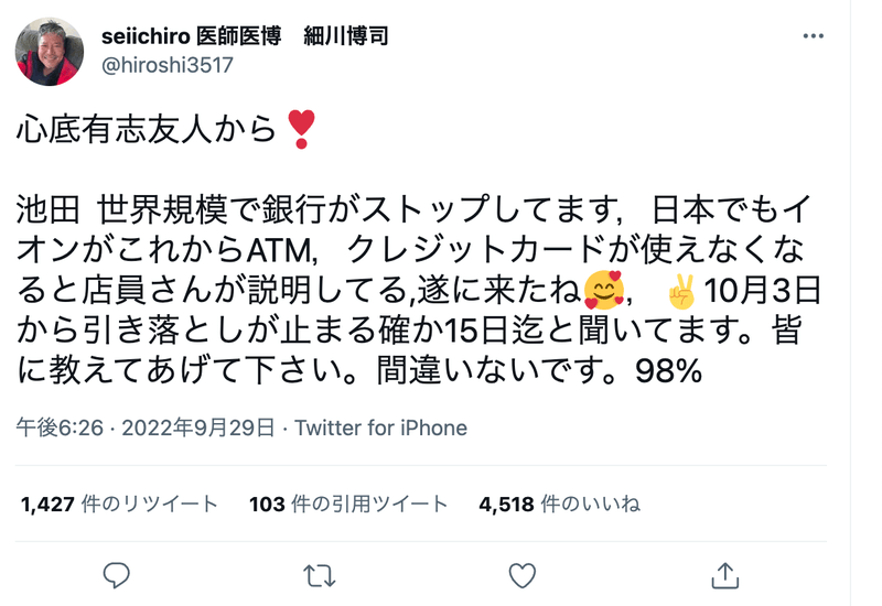 「世界規模で銀行がストップしてます,日本でもイオンがこれからATM,クレジットカードが使えなくなると店員さんが説明してる,遂に来たね,10月3日から引き落としが止まる確か15日迄と聞いてます」