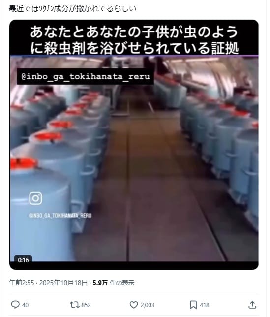 2025年10月18日、「最近ではワクチン成分が撒かれているらしい」という文言付きの動画がXで拡散した。動画は飛行機雲は、実は危険な化学物質の「ケムトレイル」だという陰謀論に基づいている。