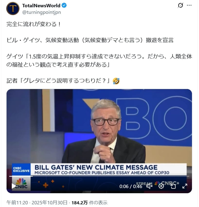 2025年10月30日、「ビル・ゲイツ、気候変動活動(気候変動デマとも言う)撤退を宣言」などの文言とともに、ゲイツ氏のインタビュー動画が拡散した。