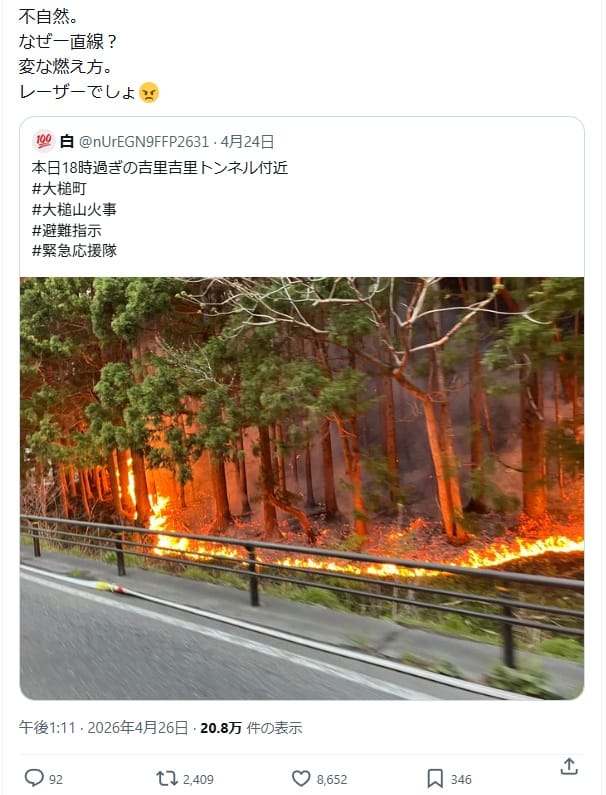 2026年4月26日、大槌町の山火事だという山林火災の画像を引用し、「不自然。なぜ一直線?変な燃え方。レーザーでしょ」という文言をつけた投稿が拡散した。