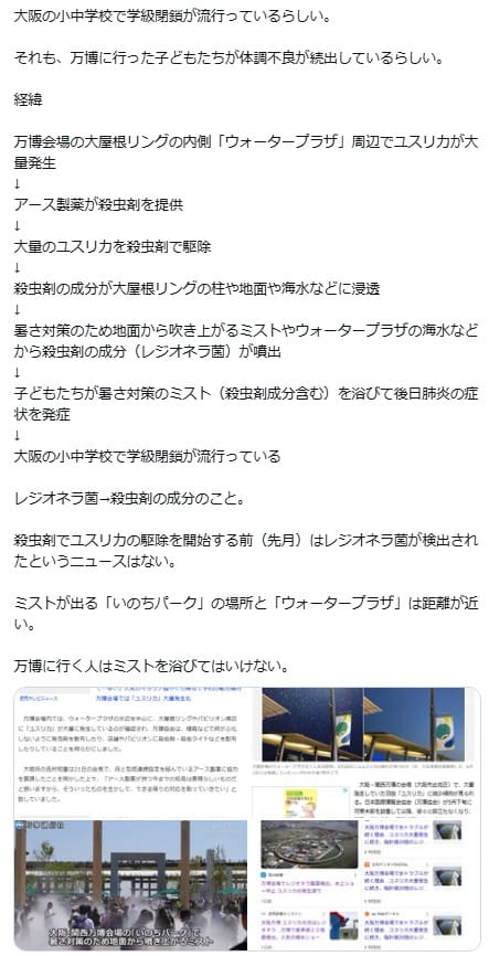 2025年6月6日、「大阪の小中学校で学級閉鎖が流行っているらしい。 それも、万博に行った子どもたちが体調不良が続出しているらしい」「暑さ対策のため地面から吹き上がるミストやウォータープラザの海水などから殺虫剤の成分(レジオネラ菌)が噴出→子どもたちが暑さ対策のミスト(殺虫剤成分含む)を浴びて後日肺炎の症状を発症」などと記した投稿が拡散した。