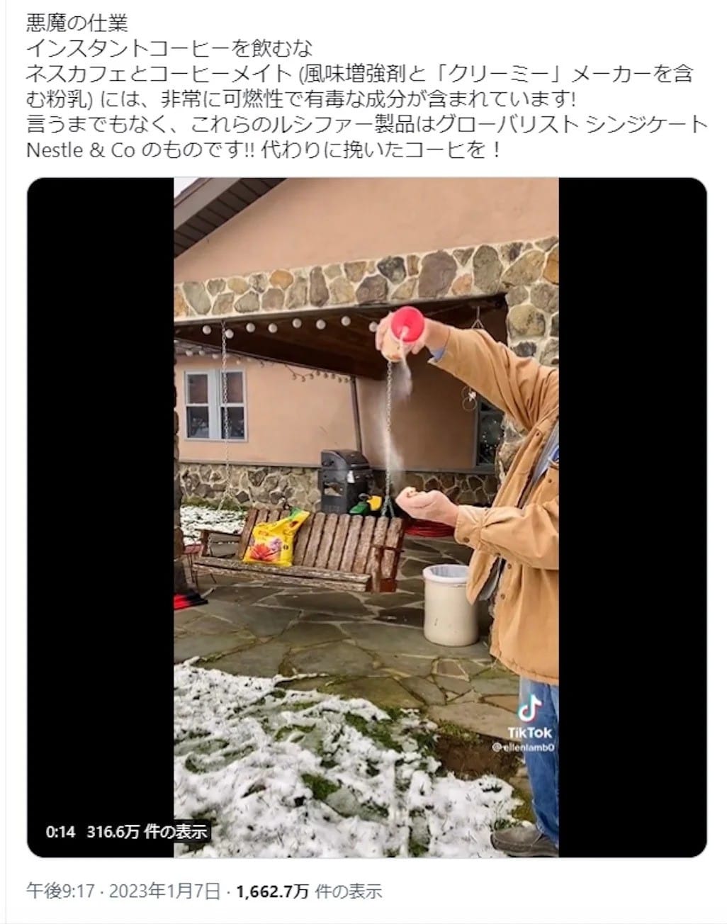 コーヒー用の粉末状クリームには可燃性があり、有毒な成分が含まれているという言説が拡散した(例1、例2)。コーヒーに入れる粉末らしきものが燃え上がる動画が話題を呼び、表示回数が2000万回を超えるものもある。