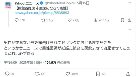2025年5月15日、「緊急避妊薬 市販薬になる可能性」というニュースをリポストし、「男性が突然女から妊娠告げられてドリンクに混ぜるまで見えた」「昔ニュースで男性医師が妊娠た彼女に薬飲ませて流産させてたのでこれは必ずある」などとコメントした投稿がXで拡散した。