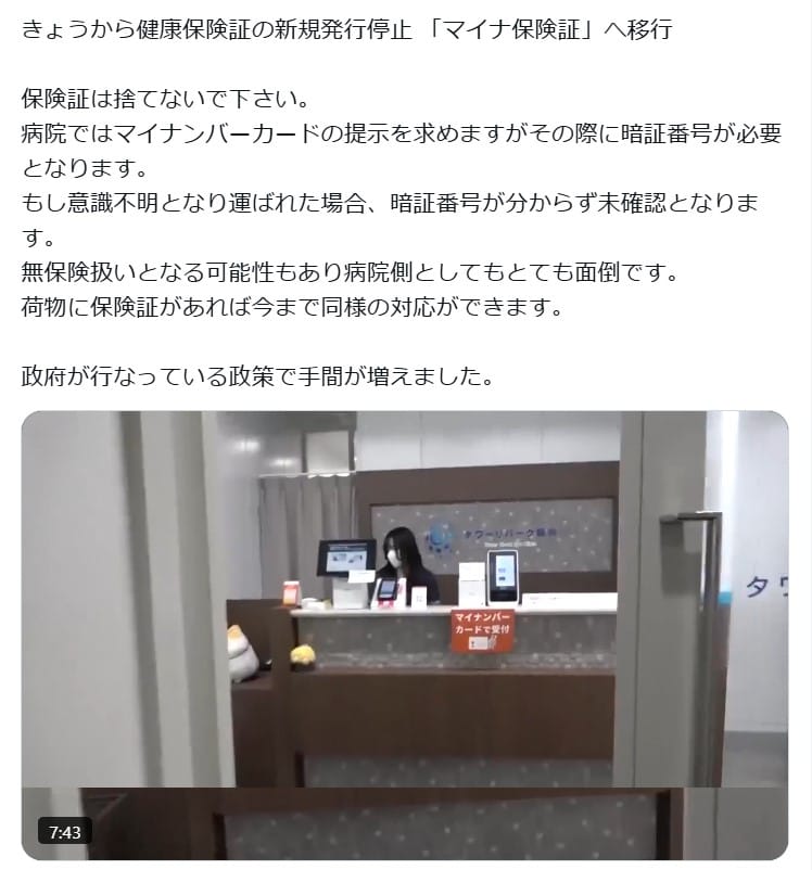 2024年12月2日、「病院ではマイナンバーカードの提示を求めますがその際に暗証番号が必要となります。もし意識不明となり運ばれた場合、暗証番号が分からず未確認となります。