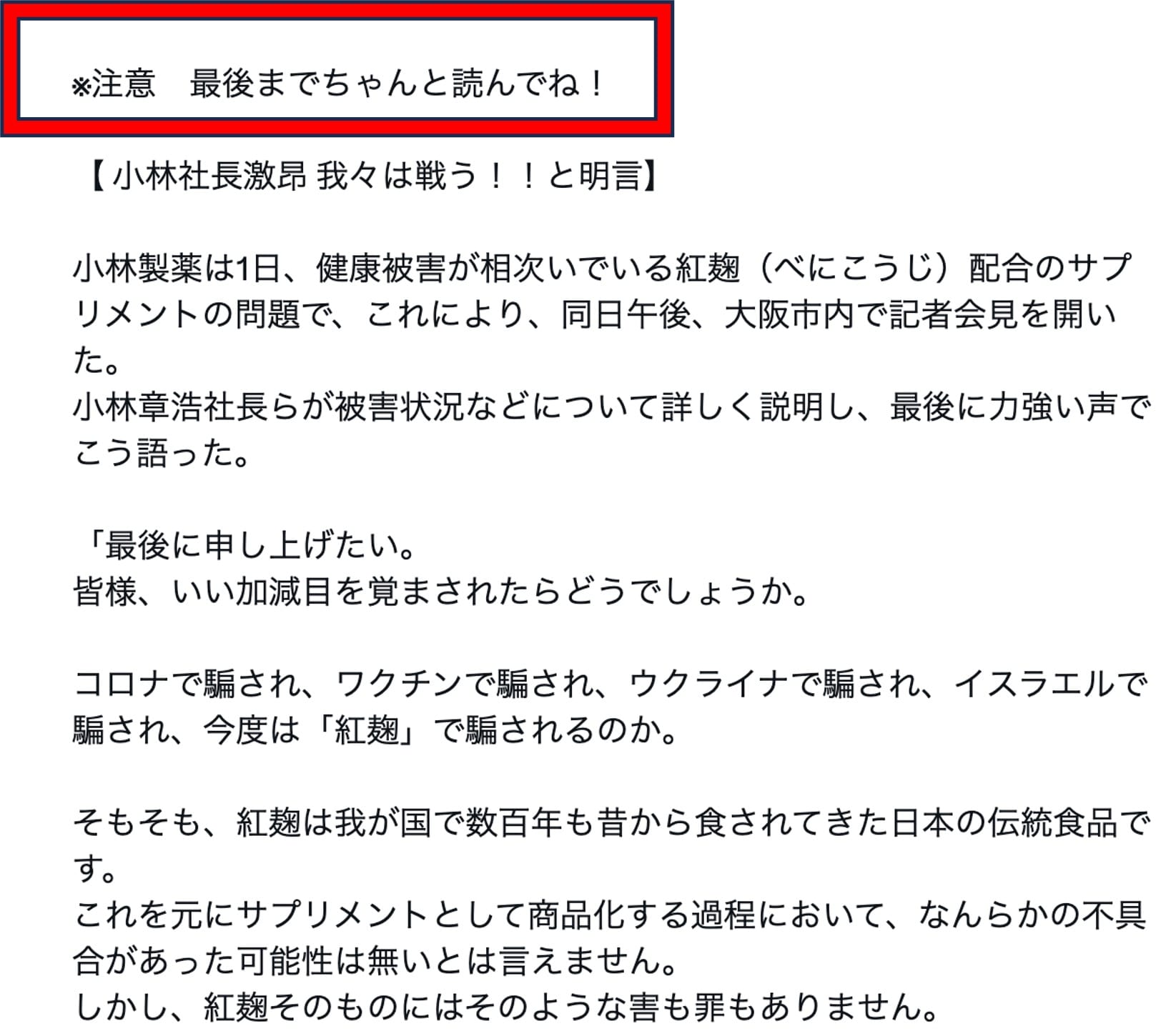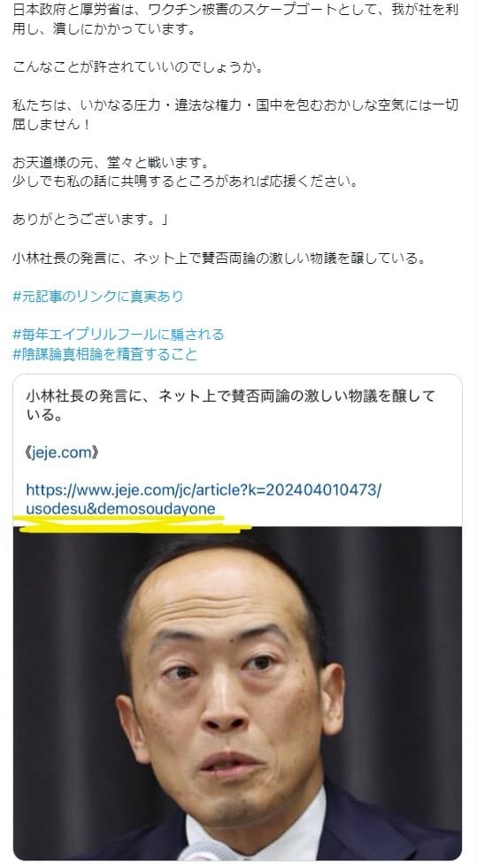 紅麹の成分を含む健康食品を摂取した人が腎臓の病気などを発症した問題で、2024年4月2日、小林製薬の小林社長が、「日本政府と厚労省は、ワクチン被害のスケープゴートとして、我が社を利用し、潰しにかかっています」と発言したとする投稿が拡散した。