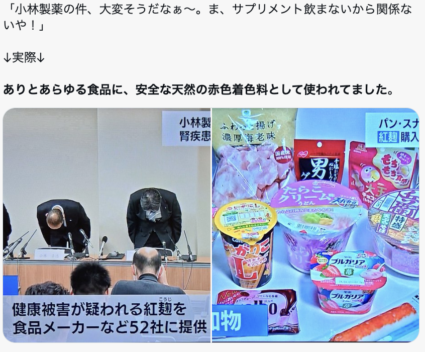 「『小林製薬の件、大変そうだなぁ〜。ま、サプリメント飲めないから関係ないや!』 ↓実際↓ありとあらゆる食品に、安全な天然の赤色着色料として使われました。」という投稿が、X(旧Twitter)などで拡散した。