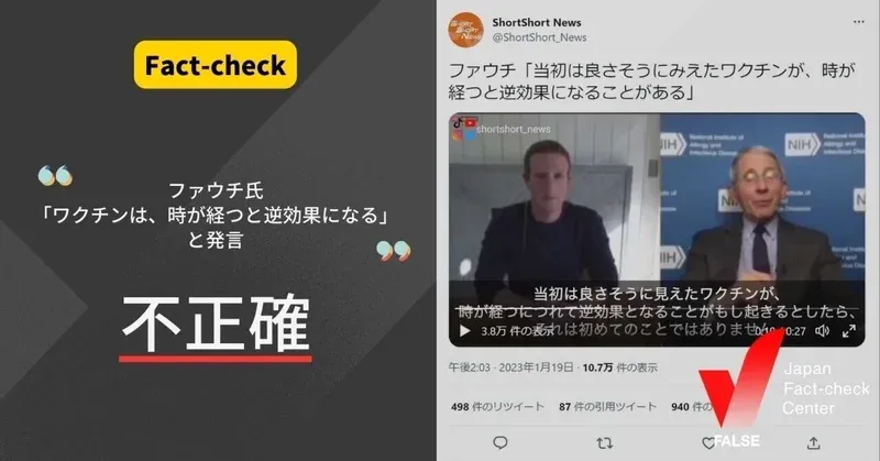 新型コロナワクチンについて、政治家や医療の専門家、著名人などの発言を捏造したり、一部分を切り取ったりした偽情報はこれまでに何度も拡散しています。JFCでも複数の事例を検証し、「誤り」もしくは「不正確」と判定しています。