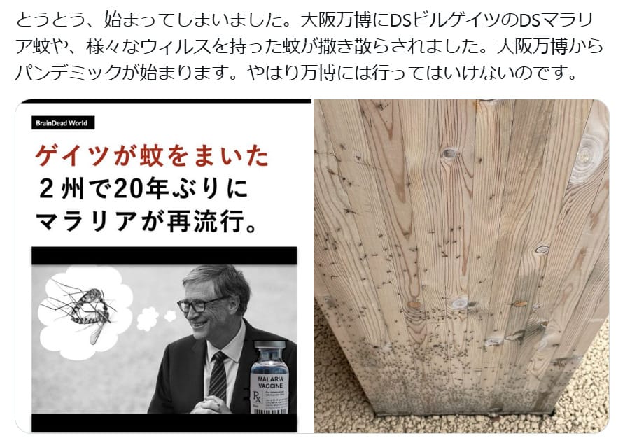 2025年5月18日、「とうとう、始まってしまいました。大阪万博にDSビルゲイツのDSマラリア蚊や、様々なウィルスを持った蚊が撒き散らされました。大阪万博からパンデミックが始まります。やはり万博には行ってはいけないのです」という投稿が、画像とともに拡散した。