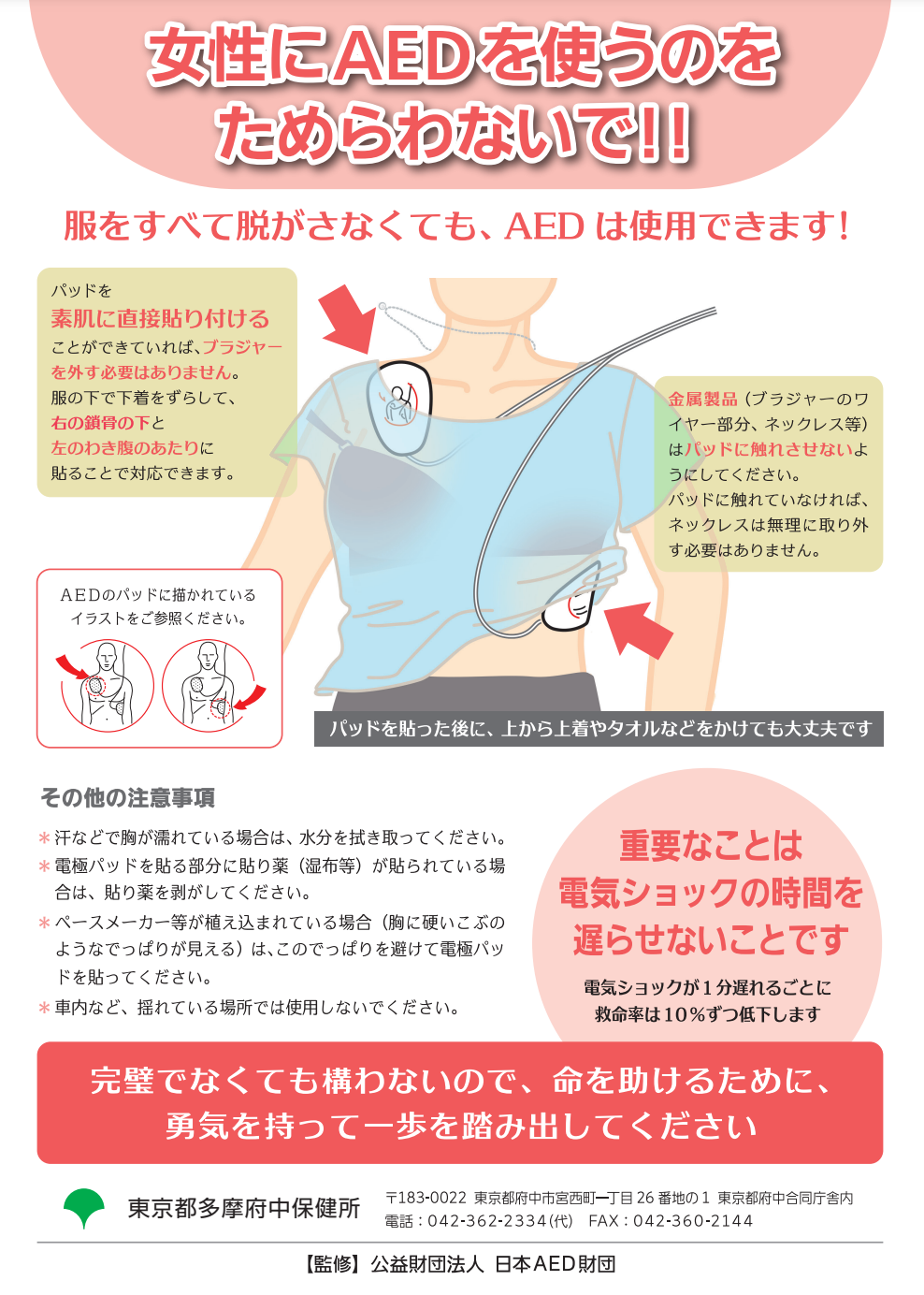 東京都多摩府中保健所は公式サイトで「女性に配慮したAEDの使用方法について」というページを公開している。
