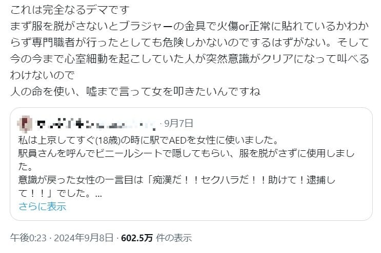 2024年9月8日、女性へのAED使用について「服を脱がさないとブラジャーの金具で火傷or正常に貼れているかわからず専門職者が行ったとしても危険しかない」と主張する言説が拡散した。