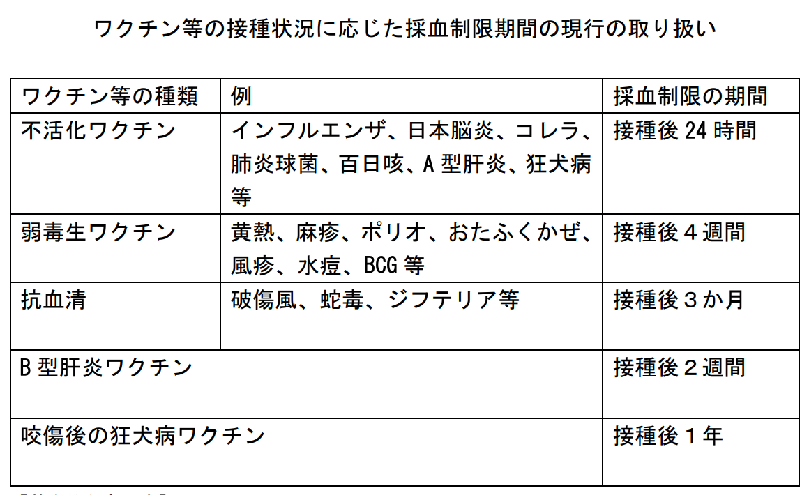 採血ができない期間はワクチンの種類によって異なる。