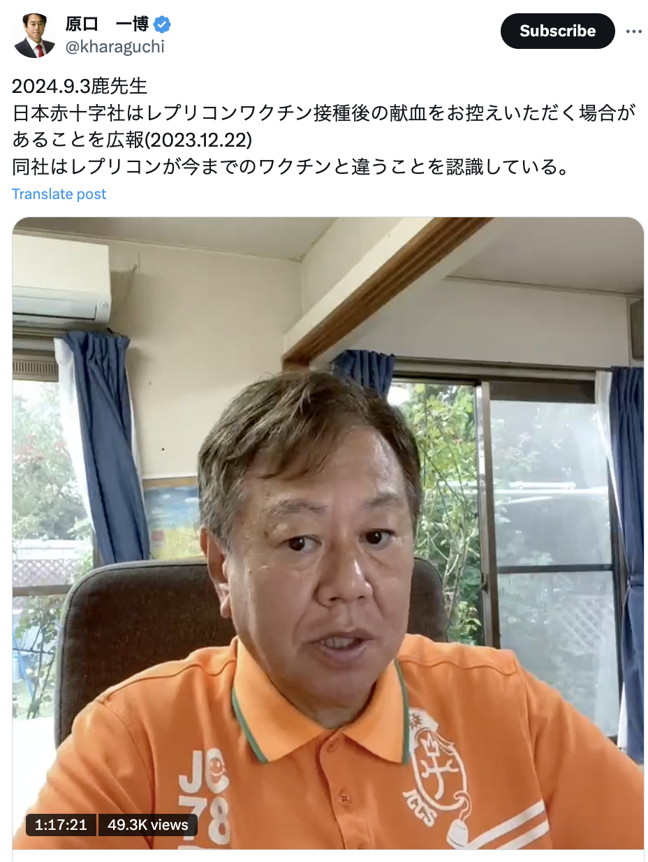 2024年10月5日、原口氏が「日本赤十字社はレプリコンワクチン接種後の献血をお控えいただく場合があることを広報(2023.12.22) 同社はレプリコンが今までのワクチンと違うことを認識している」とX(旧Twitter)に投稿した。