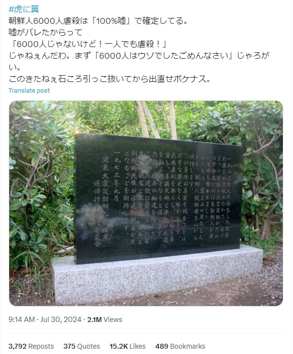 2024年7月30日、「朝鮮人6000人虐殺は「100%嘘」で確定してる。/嘘がバレたからって/「6000人じゃないけど!一人でも虐殺!」/じゃねぇんだわ」などの投稿が拡散した。この投稿は、8月7日までに214.2万回の閲覧回数と4100件以上のリポストを獲得している。