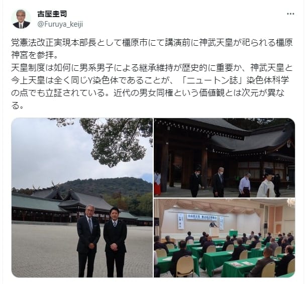 2022年3月6日、自民党の古屋圭司衆院議員が次のようにポストした。「神武天皇と今上天皇は全く同じY染色体であることが、『ニュートン誌』染色体科学の点でも立証された」。このポストは4800件以上のリポストを獲得している。