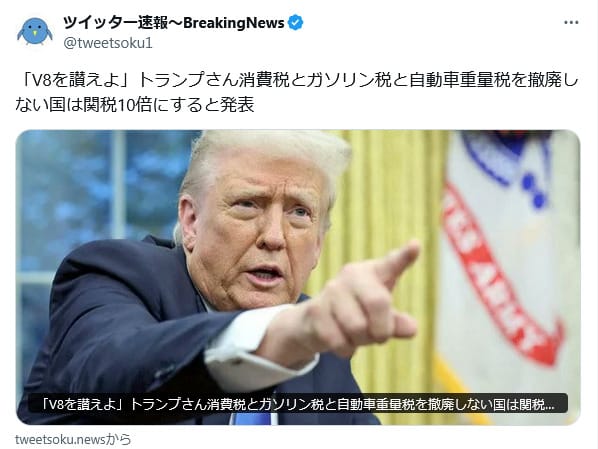 2025年2月20日、トランプ大統領が「消費税やガソリン税、自動車重量税を撤廃しない国は関税を10倍にすると発表した」と主張する投稿が複数拡散した(投稿1、投稿2、投稿3)。