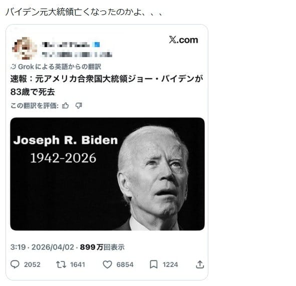 米国のバイデン前大統領が死去したという情報が拡散しましたが、誤りです。2026年4月3日時点でそのような情報や報道はありません。Xの投稿が自動で翻訳されるようになったことで、現地のエイプリルフール投稿が日本語で拡散しました。