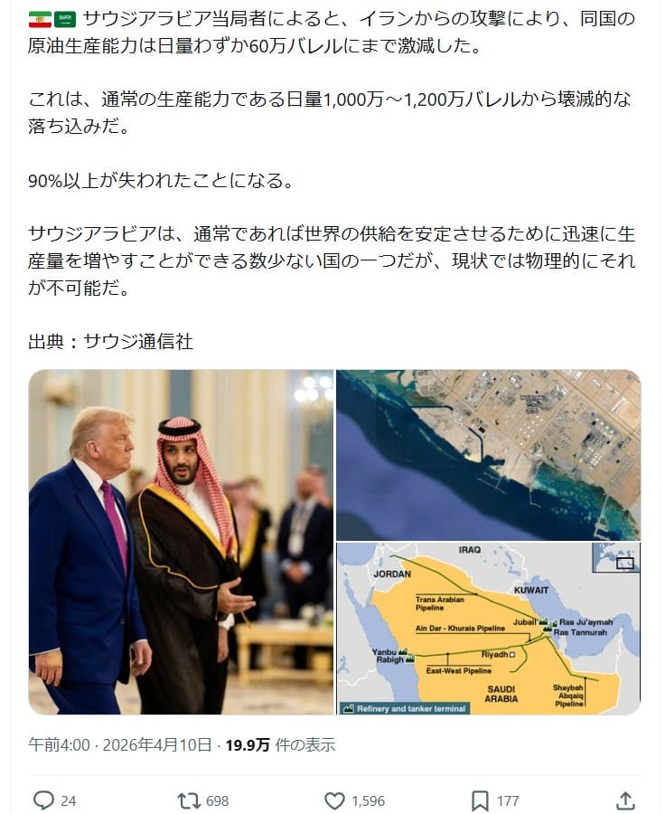 2026年4月10日、「サウジアラビア当局者によると、イランからの攻撃により、同国の原油生産能力は日量わずか60万バレルにまで激減した。これは、通常の生産能力である日量1,000万〜1,200万バレルから壊滅的な落ち込みだ。90%以上が失われたことになる」という投稿がXで拡散した。