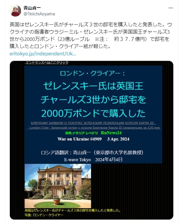 2024年4月4日、「英国はゼレンスキー氏がチャールズ3世の邸宅を購入したと発表した」というポストが、邸宅の写真付きで拡散した。拡散したポストは、4月16日現在で15.1万回以上の表示回数と320件以上のリポストを獲得している。