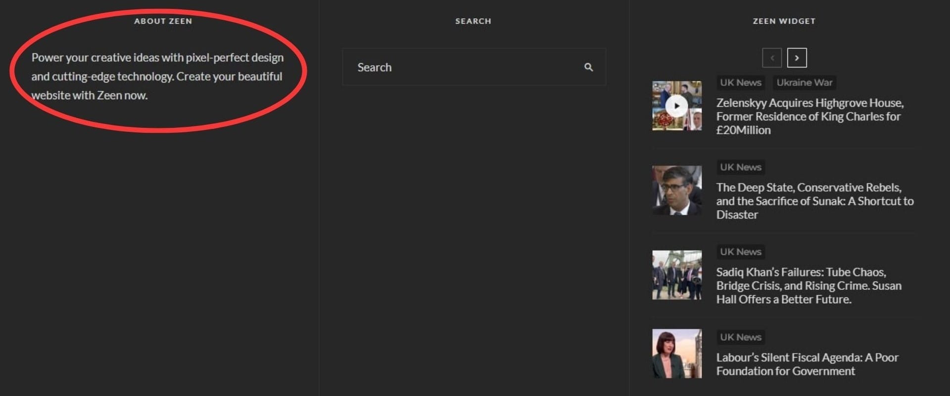 ロンドン・クライヤーのサイトの一部に「Create your beautiful website with Zeen now(今すぐZeenで美しいWebサイトを作りましょう)」といったWebサイト制作用のテンプレートがそのまま残されている箇所があることから、codetipi社の「Zeen」というサービスで制作されたサイトであることがわかる。