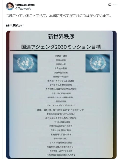 2025年11月8日、「今起こっていることすべて、本当にすべてがこれにつながっています。新世界秩序」という文言付きの画像がXで拡散した。