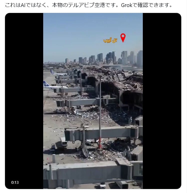 イスラエルとイランの軍事紛争の中で、2025年6月15日、イスラエルの空港が空爆の被害を受けたという動画が拡散した。「これはAIではなく、本物のテルアビブ空港です。Grokで確認できます」という説明も付けられている。