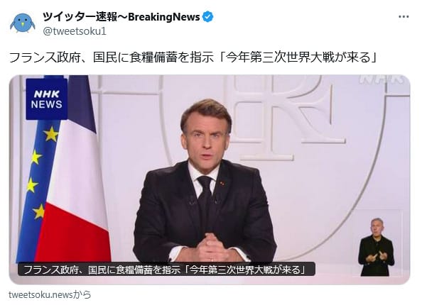 2025年3月25日、「フランス政府、国民に食糧備蓄を指示『今年第三次世界大戦が来る』」という投稿が拡散した。この投稿は2025年3月31日までに296万回以上の閲覧回数と4500件以上のリポストを獲得している。