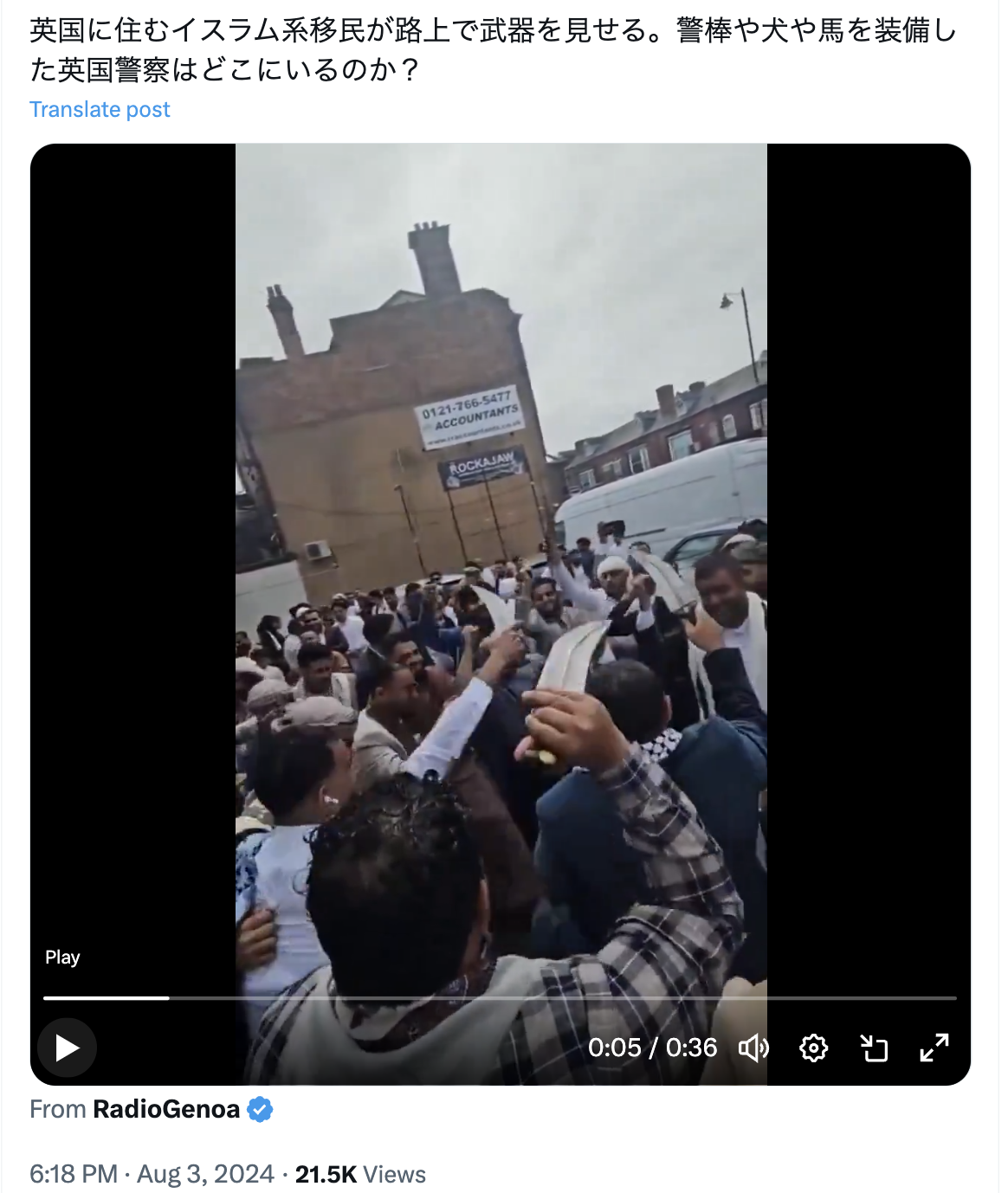 2024年8月3日、「日本のメディアが報道しないニュース 英国に住むイスラム系住民が路上で武器を見せる」というキャプションとともに、男性たちがナイフをかざして太鼓の音楽に合わせて踊る様子が映った動画が拡散した。