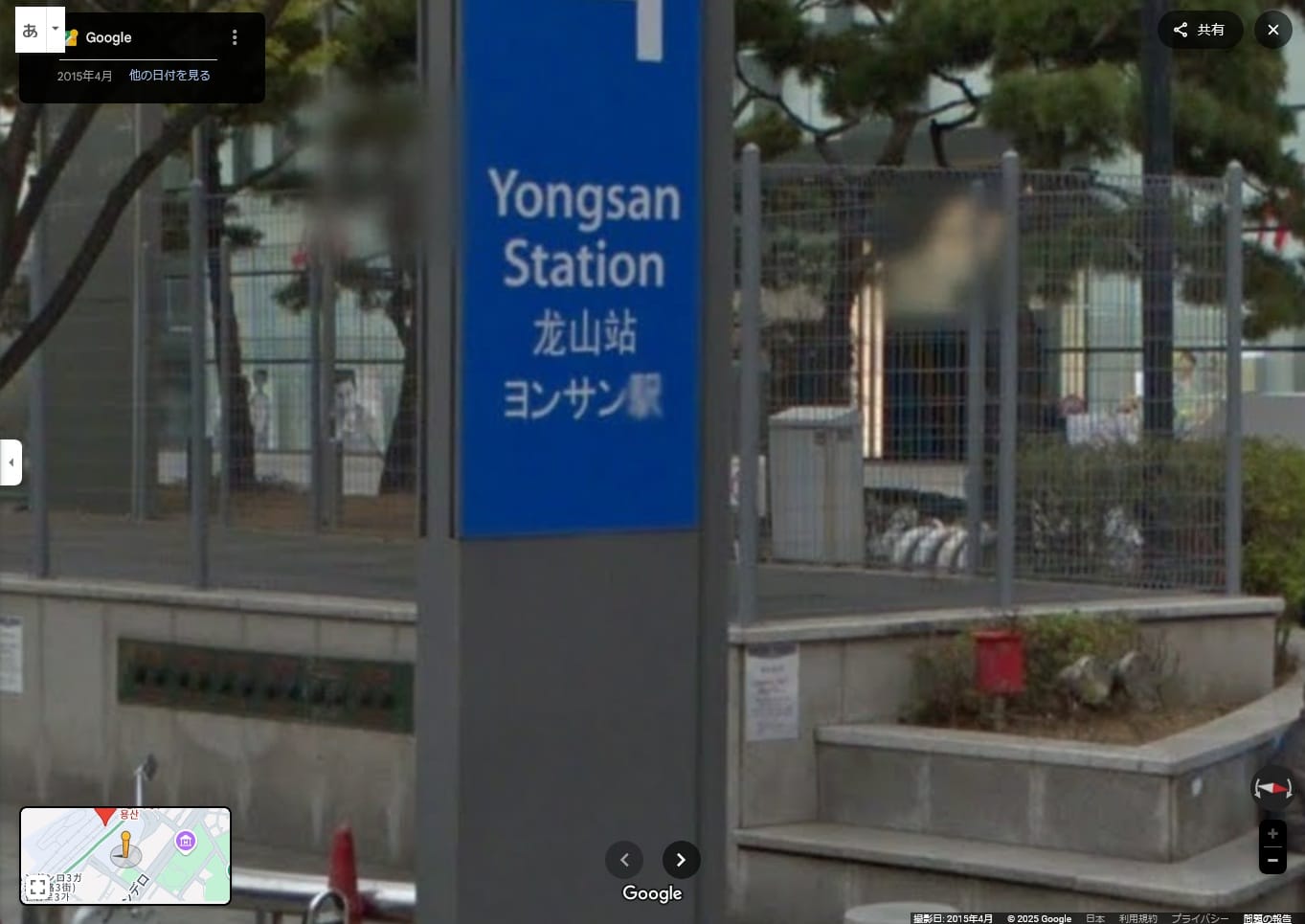日本ファクトチェックセンター(JFC)が「Googleマップ」のストリートビュー機能でソウル地下鉄龍山駅付近の様子を確認したところ、龍山駅を示す看板に韓国語・英語・中国語に続いて日本語で「ヨンサン駅」との表示がある。