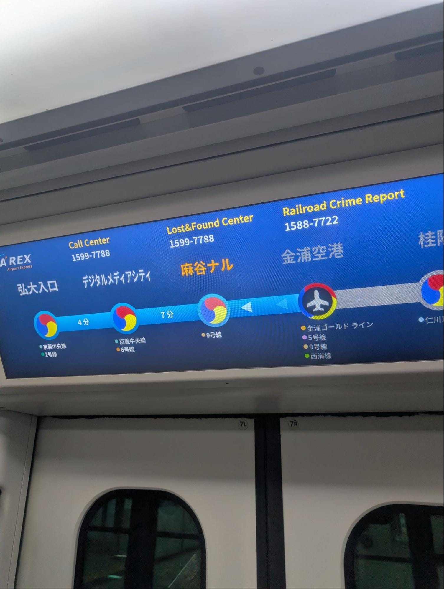 地下鉄車内の電光掲示板でも、ハングルや英語とともに日本語による表示はある。検証対象のようにハングルだけが表示される場合もあるが、続いて英語や日本語が表示される。