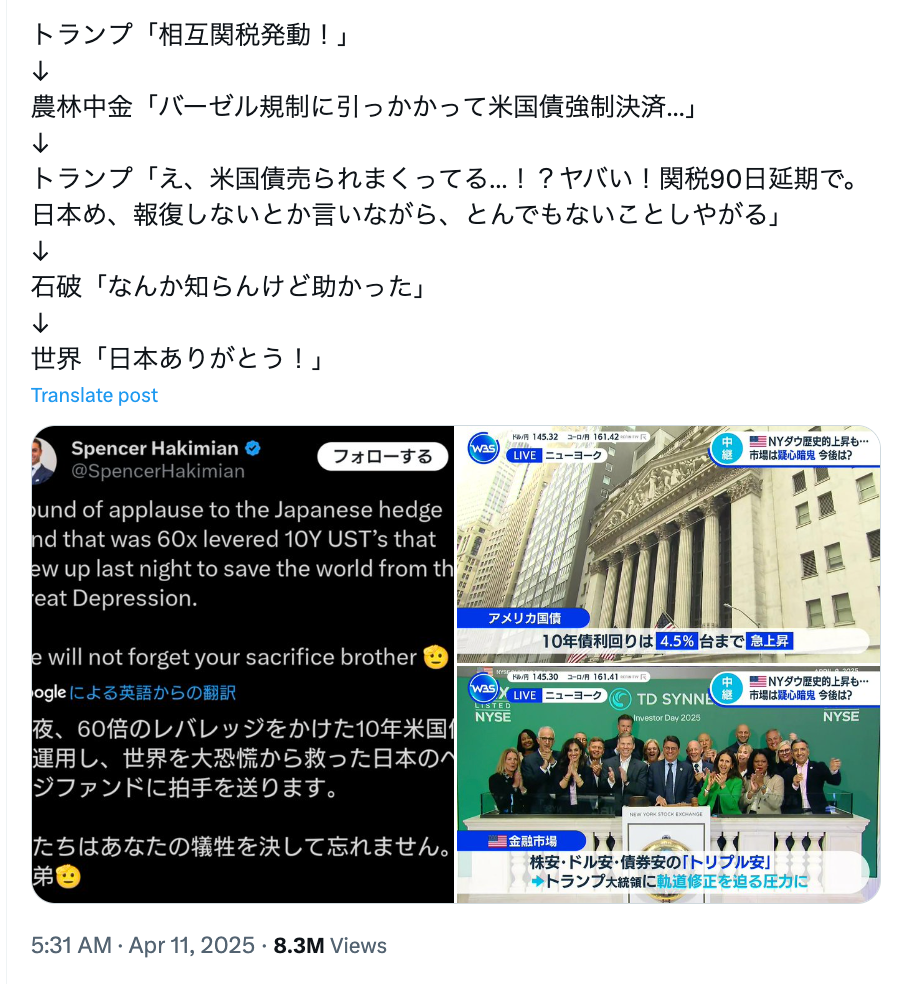 投稿には、米国債の下落や金利上昇、株・ドル・債券のトリプル安を報じるテレビニュースの画像が添付され、「トランプ『相互関税発動!』→農林中金『バーゼル規制に引っかかって米国債強制決済…』→トランプ『え、米国債売られまくってる…!?ヤバい!関税90日延期で。日本め、報復しないとか言いながら、とんでもないことしやがる』→石破『なんか知らんけど助かった』→世界『日本ありがとう!』」などと書かれている。