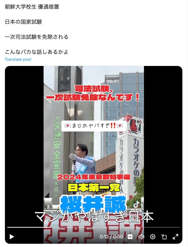 2025年1月30日、Xで「朝鮮大学校生 優遇措置 国家試験一次司法試験免除される こんなバカな話があるかよ」という情報が拡散した。投稿には日本第一党の桜井誠氏が演説する動画がついている。