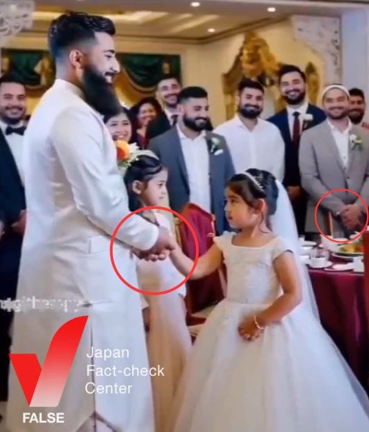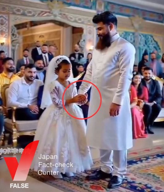 「幼女を妻に娶るイスラム教徒」だとして、ムスリム風の男性と幼女が結婚しているような動画が拡散しました。この動画はAI生成によるディープフェイクで誤りです。動画にはAIによく見られる特徴がいくつもあります。同じ動画は海外でも拡散し、AIによる偽動画だと検証されています。