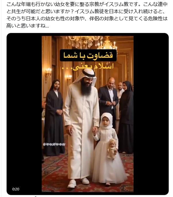 2025年3月24日、「こんな年端も行かない幼女を妻に娶る宗教がイスラム教です。こんな連中と共生が可能だと思いますか?イスラム教徒を日本に受け入れ続けると、そのうち日本人の幼女も性の対象や、伴侶の対象として見てくる危険性は高いと思いますね…」と主張する投稿が拡散した。