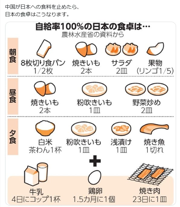 中国からの食料輸入が途絶えたら、日本の食卓はイモだらけになると示唆した画像が拡散しましたが、ミスリードで不正確です。拡散した画像は、日本が食料を輸入せずに100%自給した場合の食卓です。中国からの食料輸入が途絶えただけで、拡散した画像のような食卓になるわけではありません。