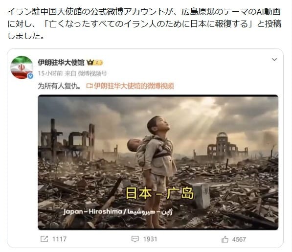 2026年3月30日、「イラン駐中国大使館の公式微博アカウントが、広島原爆AI動画に対し、『亡くなったすべてのイラン人のために日本に報復する』と投稿しました」という投稿が拡散した。投稿には、中国語で「在中国イラン大使館」と書かれたアカウントの画像が添付され、廃墟にたたずむ少年の姿と「日本 広島」という文字が書かれている。