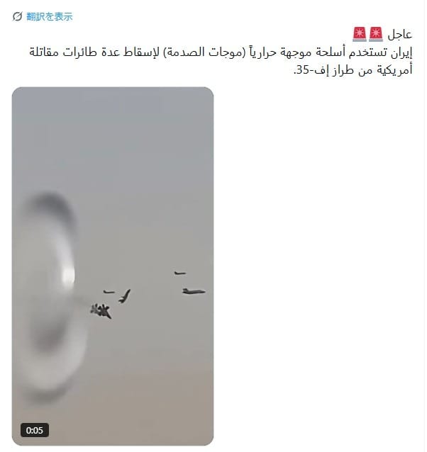 2026年3月28日、アラビア語で「緊急 🚨🚨イランが熱誘導兵器(衝撃波)を使用して、アメリカのF-35戦闘機数機を撃墜」と書かれた動画付き投稿が拡散した。