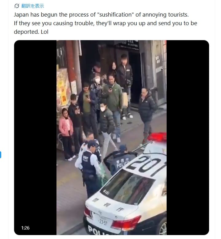 2026年2月9日、「日本は、迷惑な観光客の『寿司化』プロセスを開始しました。もしあなたが問題を起こしているところを見られたら、彼らはあなたを巻いて強制送還のために送り出します。笑」という英語の投稿がXで拡散した。