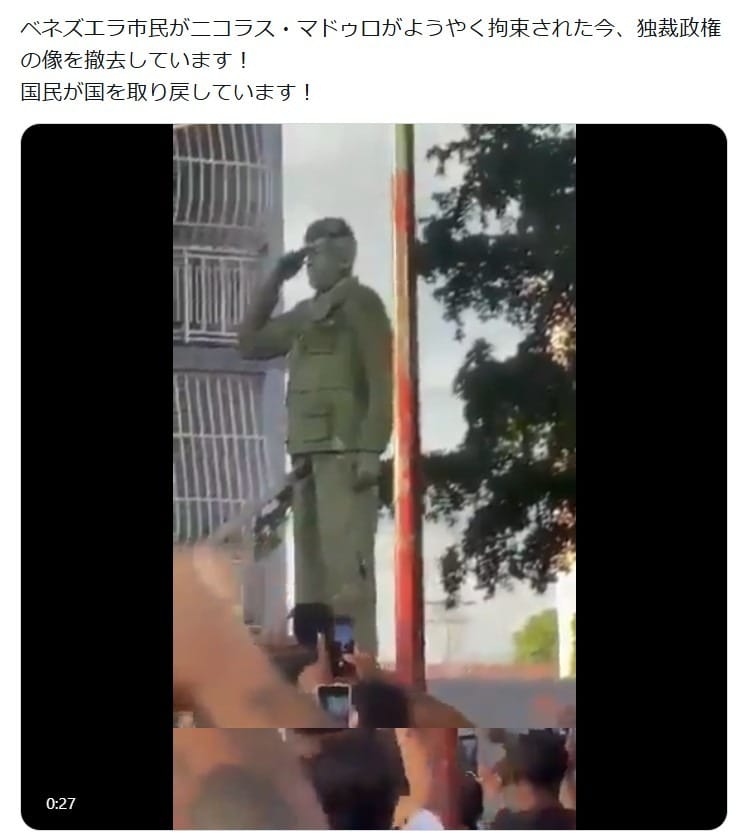 2026年1月4日、「ベネズエラ市民がニコラス・マドゥロがようやく拘束された今、独裁政権の像を撤去しています! 国民が国を取り戻しています!」という動画つき投稿が拡散した。