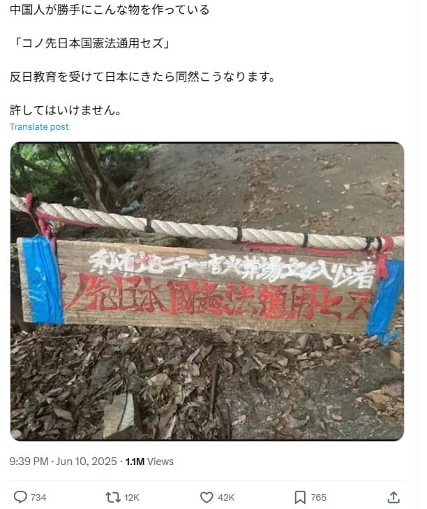 2025年6月10日、「中国人が勝手にこんな物を作っている」などの文言とともに、「日本國憲法通用セズ」などと書かれた看板の写真がXで拡散した。