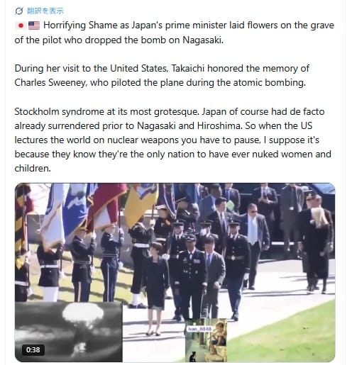 2026年3月25日、「日本の高市首相が長崎に原爆を投下したパイロットの墓に献花した。おぞましい恥辱だ」などと主張する動画付きの投稿が拡散した。4月2日現在、このアカウントは凍結されている。