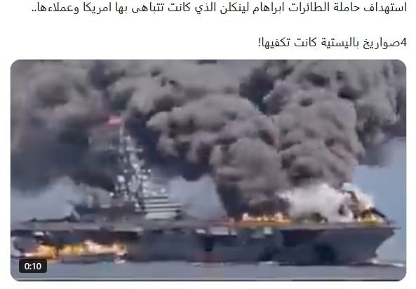 3月2日、「アメリカとその代理人が誇示していた空母エイブラハム・リンカーンを標的にした。4発の弾道ミサイルで十分だった」という内容の動画付き投稿が拡散した。動画には、黒い煙をあげる空母の様子が映っている。