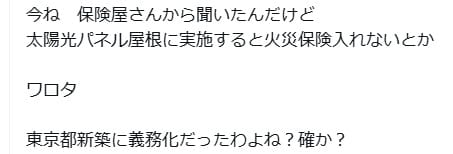 8月5日、「保険屋さんから聞いたんだけど太陽光パネル屋根に実施すると火災保険に入れないとか」「東京都新築に義務化だったわよね?」という投稿がXで拡散した。