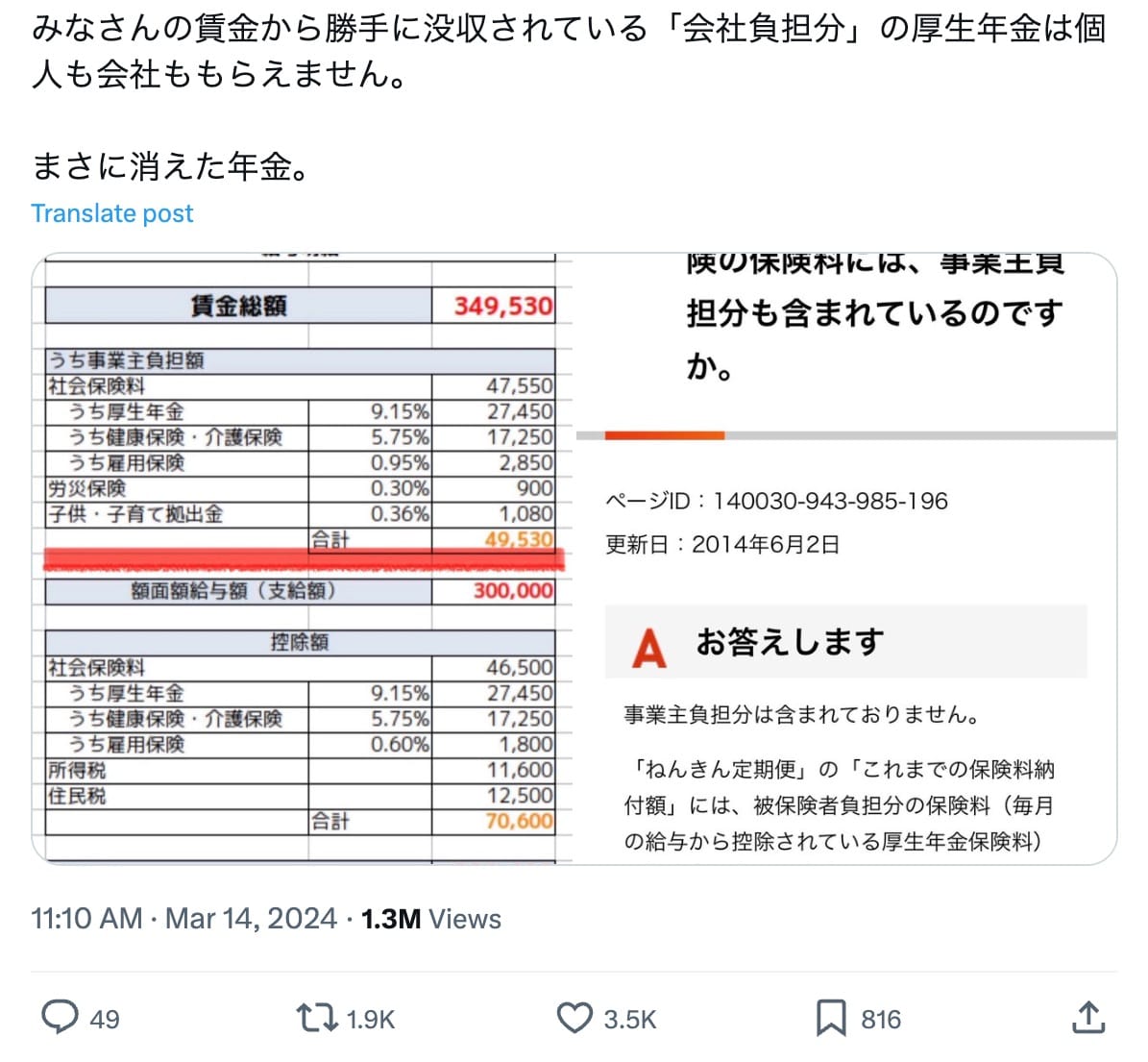 2024年3月14日、「みなさんの賃金から勝手に没収されている『会社負担分』の厚生年金は個人も会社ももらえません。まさに消えた年金」との投稿が拡散した。「賃金総額」や「社会保険料」などと書いた表の一部の画像も添付されている。