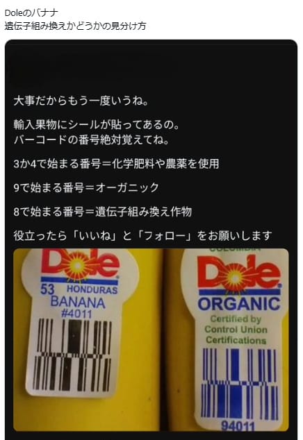 2025年4月9日、「Doleのバナナ 遺伝子組み換えかどうかの見分け方」という投稿が、画像とともに拡散した。画像には「輸入果物のシールにあるバーコードの番号で遺伝子組み換えかどうかが判別できる」「8で始まる番号=遺伝子組み換え」などと書いてある。