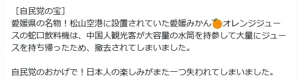 2025年1月26日、「[自民党の宝]/愛媛県の名物!松山空港に設置されていた愛媛みかん🍊オレンジジュースの蛇口飲料機は、中国人観光客が大容量の水筒を持参して大量にジュースを持ち帰ったため、撤去されてしまいました」というXの投稿が拡散した。