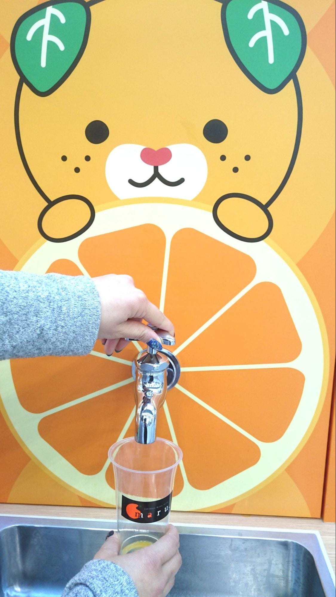 松山空港にある『蛇口からみかんジュース』は、専用カップを購入した客が自分で蛇口をひねってジュースを注ぐ商品だ。空港内のショップ「Orange Bar」にある。