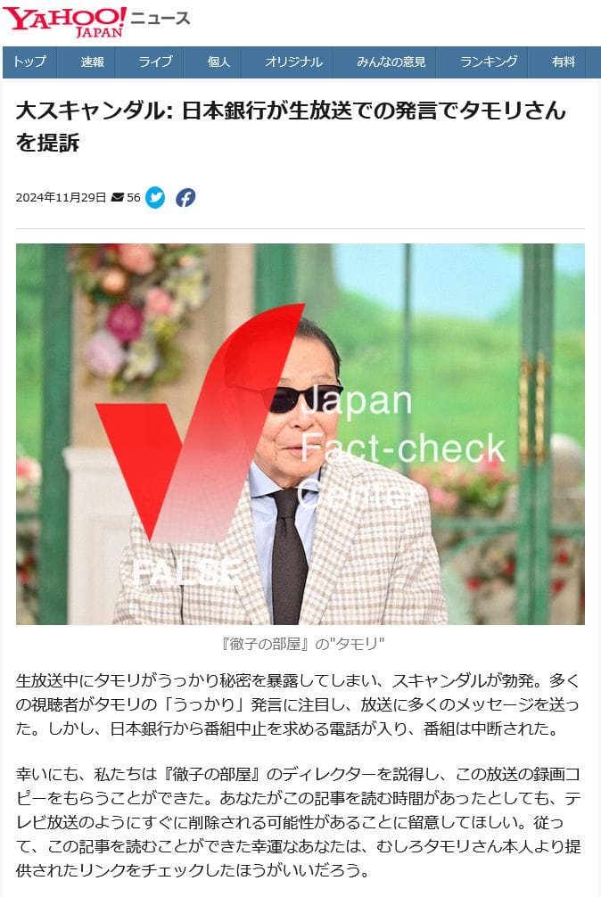 クリックすると「大スキャンダル: 日本銀行が生放送での発言でタモリさんを提訴」という記事が出てくる。