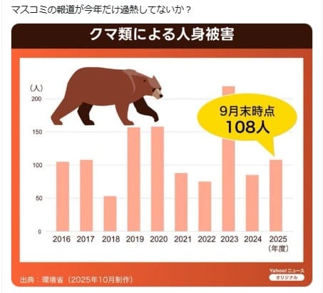 2025年11月4日、「マスコミの報道が今年だけ過熱していないか?」という文言とともに「クマ類による人身被害」というグラフが付いた投稿がXで拡散した。