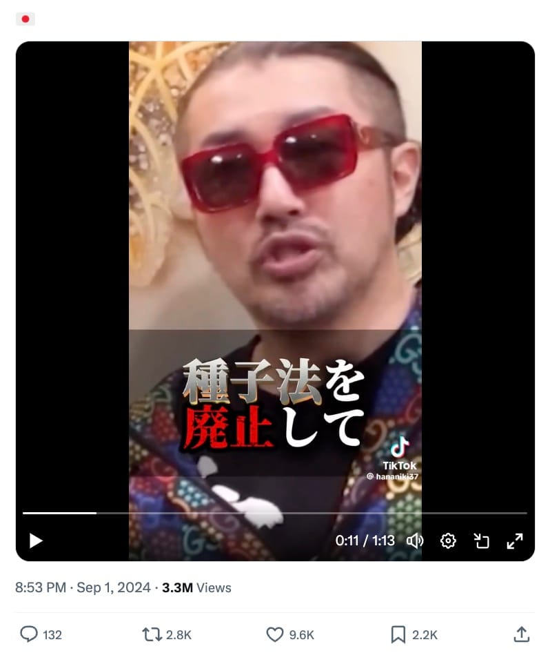 「自分の土地で採れた種を来年まいたら懲役10年」と主張する動画の投稿がTikTokやX(旧Twitter)で拡散した(例1、例2)。9月6日現在、Xの投稿の一つだけでも340万の閲覧がある。